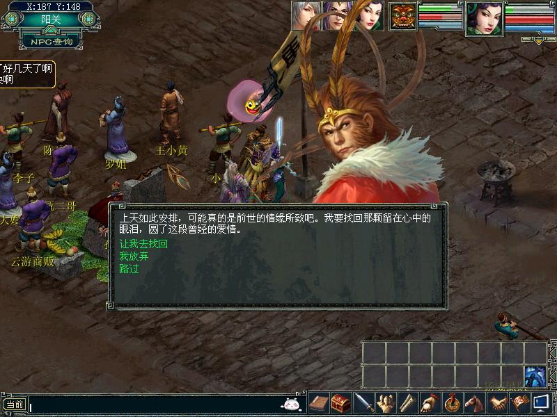 在一段简短的动画之后,我们的七夕活动正式开始了,玩家可以向阳关(179,162)的孙悟空来领取任务。玩家会从5个任务中随机领取到一个。