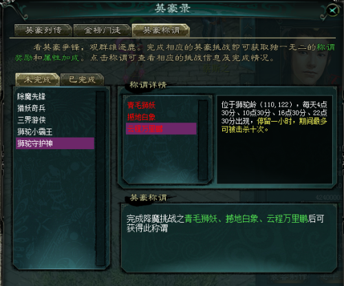 本周维护后,完成英豪录中相应的降魔挑战即可获得具有属性加成的英豪称谓。打开英豪录中英豪称谓页面可以查看称谓的获得方式,称谓的属性加成则可以在称谓界面中查看。