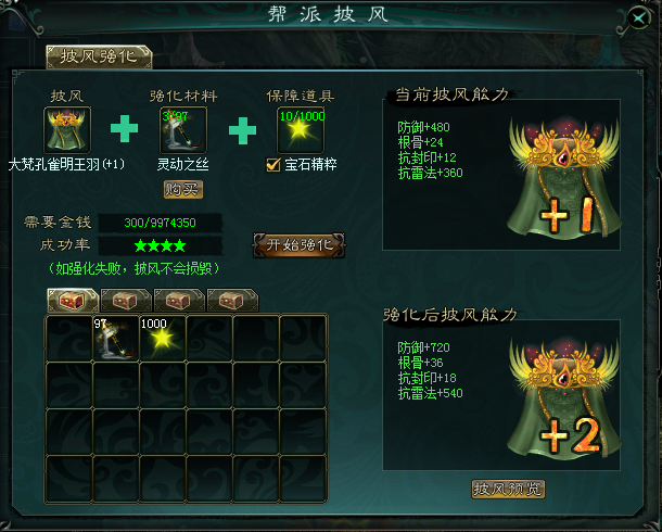 (2) 强化目标等级为2—6级时,可使用宝石精粹作为强化保障道具,使用后如强化失败,则披风不会损毁,强化目标等级为7—8级时可使用披风强化保障符作为强化保障道具,可在披风强化界面上使用玉玲珑购买,强化目标等级为9—10级时不可使用强化保障道具;