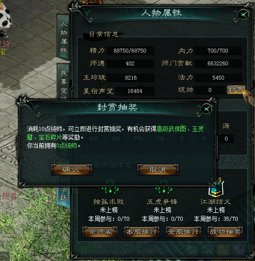 打开人物属性—人物活跃界面,可查看统帅值和进行抽奖。
