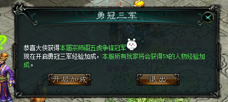 维护后,宗师阁五虎争锋冠军的玩家,每天20:00后将可以开启经验加成,向本服玩家立即获得一次经验奖励,并使本服玩家在当天和次日获得的人物经验提升5%。