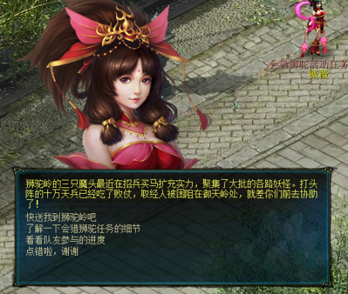 (1) 会猎狮驼分为4个阶段,每个阶段分别于每日20:00、20:30、21:00和21:15由系统开启,开启后分别会刷新出普通小妖、怪物头领、狮驼岭魔头护法(或是幻形)和三只巨大BOSS(青毛狮妖、撼地白象、云程万里鹏),怪物难度依次增加,战胜后每天分别可以获得20次、10次、10次和3次高额奖励机会;